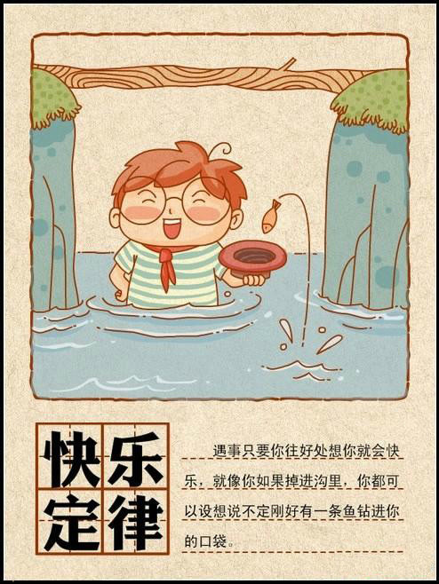 遇事只要你往好處想你就會(huì)快樂(lè),就像你如果掉進(jìn)溝里,你都可以設(shè)想說(shuō)不定剛好有一條魚(yú)鉆進(jìn)你的口袋。