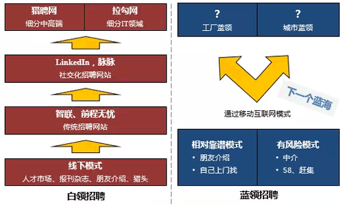 通過分析整個(gè)招聘行業(yè),我們看到白領(lǐng)招聘已經(jīng)互聯(lián)網(wǎng)化并進(jìn)入細(xì)分競(jìng)爭(zhēng)階段。由于智能手機(jī)的普及,藍(lán)領(lǐng)招聘剛剛進(jìn)入移動(dòng)互聯(lián)網(wǎng)化的窗口期,尚未有成型的玩家出現(xiàn)。信息源:揭陽人才網(wǎng)_www.gexingbei.com