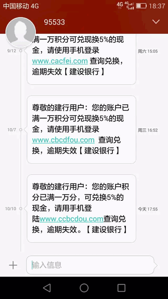 9月24日,受害人尹某,收到來自95533兌換建行賬戶積分的詐騙短信,點擊釣魚網(wǎng)站鏈接操作后被轉(zhuǎn)賬騙走5000元。