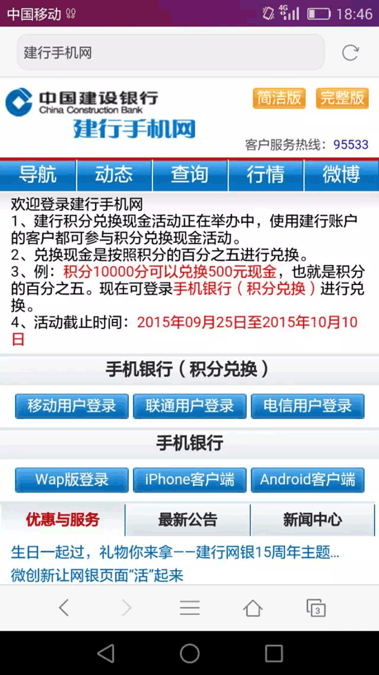 一萬積分兌換500元,簡直是天上掉現(xiàn)金的感覺,于是便有市民心動了,點擊了短信中的鏈接。這時,手機(jī)跳轉(zhuǎn)到了一個上網(wǎng)界面,顯示是“建行手機(jī)網(wǎng)”。